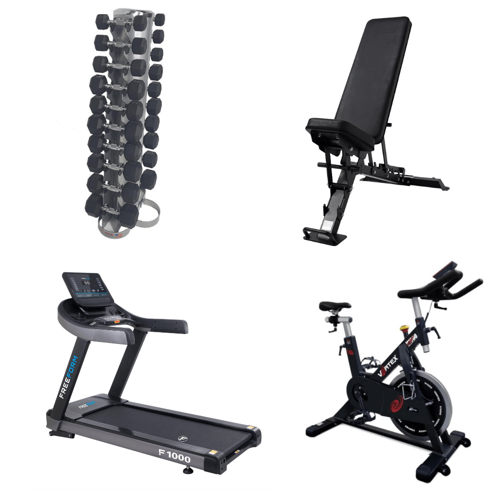The Body Corporate Package 6 consists of the FreeForm F1000 Treadmill, Vortex V1000 Spin Bike, 1-10kg Rubber Hexagonal Dumbbell Set w/ Rack and Force USA Commercial FID Bench.