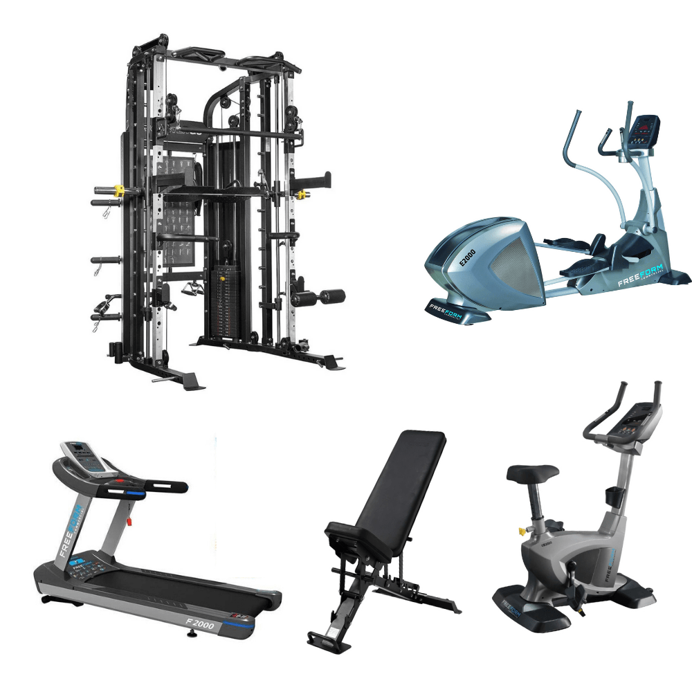 The Body Corporate Package 8 consists of the Freeform F2000 Commercial Treadmill, Freeform UB2000 Commercial Self Generating Upright Bike, Freeform E2000 Commercial Self Generating Elliptical Trainer, Force USA G6 All-In-One Trainer, Power Rack, Smith Machine Combo, Force USA Commercial FID Bench.