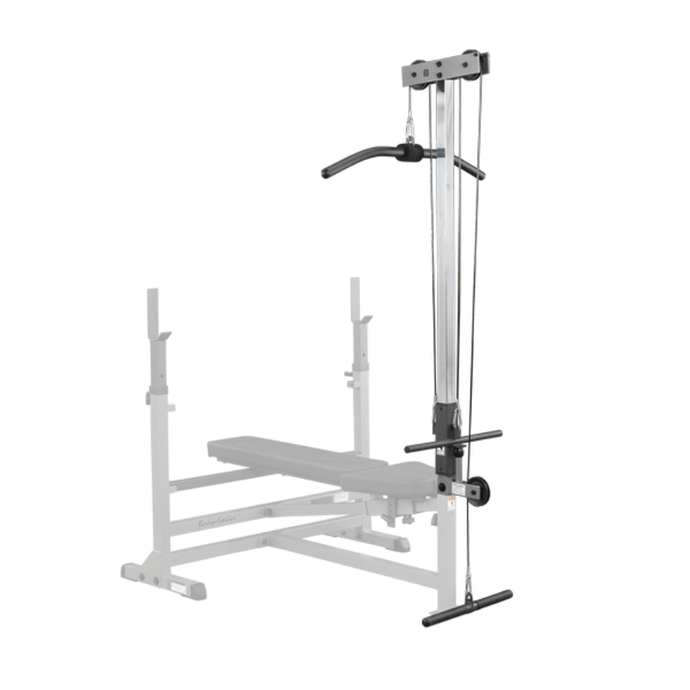 High & Low Pulleys allow you to exercise your back, arm and shoulder muscles. High strength, nylon coated aircraft quality (2200 Lb. test) cable for safe, strong workouts. Includes Lat Bar, Low Row Bar and two cables. 210.82cm high attached to the bench.