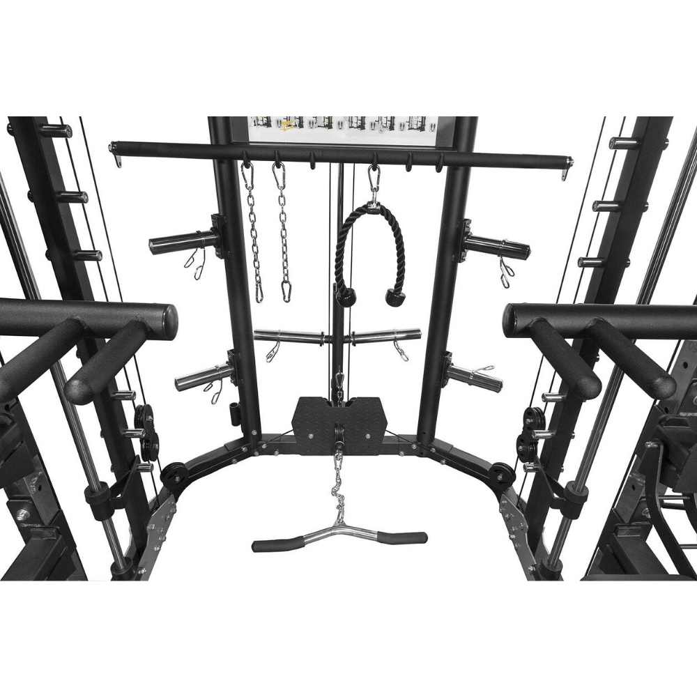 Loaded with a huge range of attachments to give you the competitive edge, The Force USA G9 All-In-One Trainer has included Leg Press, Core Trainer, Knee support for lat pull down, Lat Pull Down Bar, T-Bar, Olympic Lock Collars, Multi-Grip Dip Handles, Barbell J-hooks, Safety Spotting Arms & many more attachments. Keep your training space clean and tidy with built-in storage. The Force USA development team have added 6x Olympic sized weight plate holders, Olympic & Standard Barbell Holders & Storage Hooks for all of your attachments.