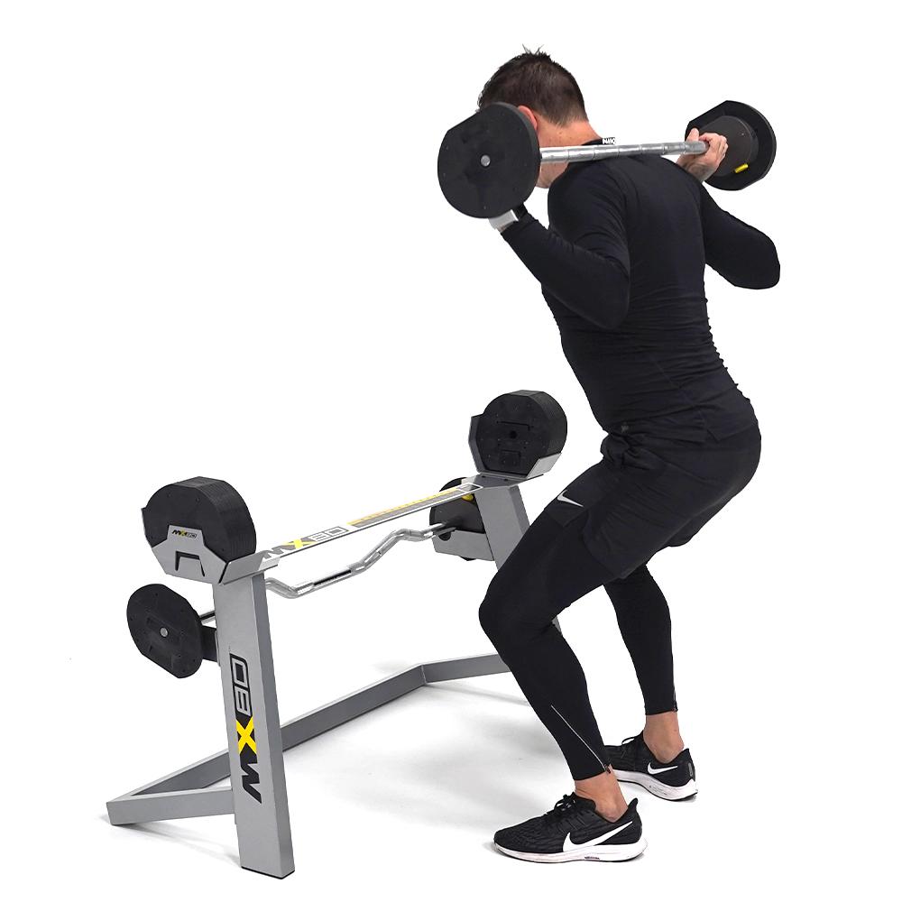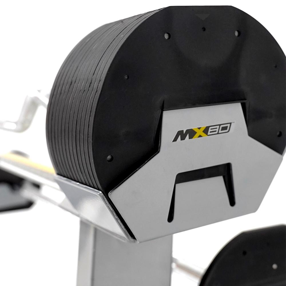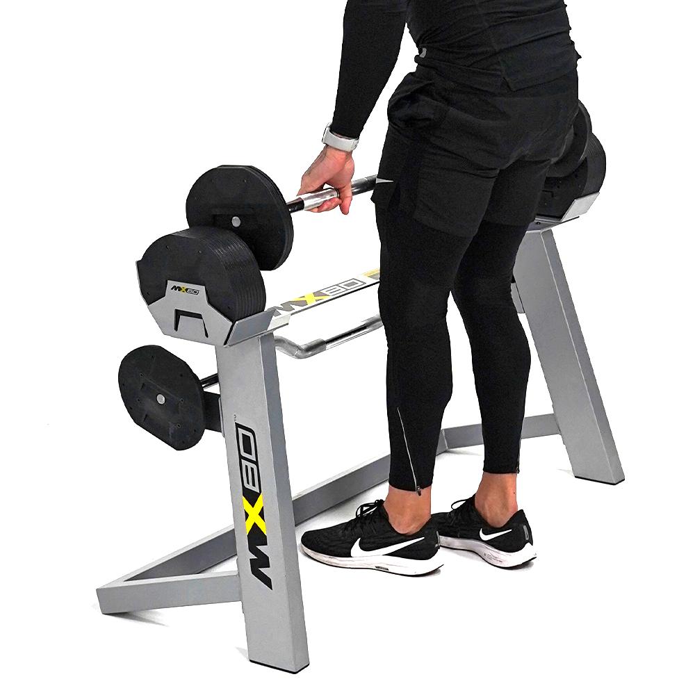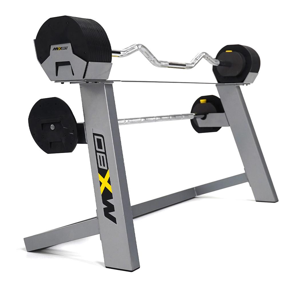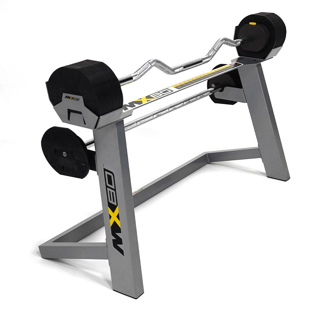 From deadlifts, presses clean and jerks the MX80 variable weight system combines a range of fixed bar options in one compact, heavy-duty weight lifting package. Replacing 26 fixed weight bars or 1140 lbs (517 kg), this industry-first adjustable barbell and EZ curl rack is designed for compact spaces and allows for seamless weight transition between reps.