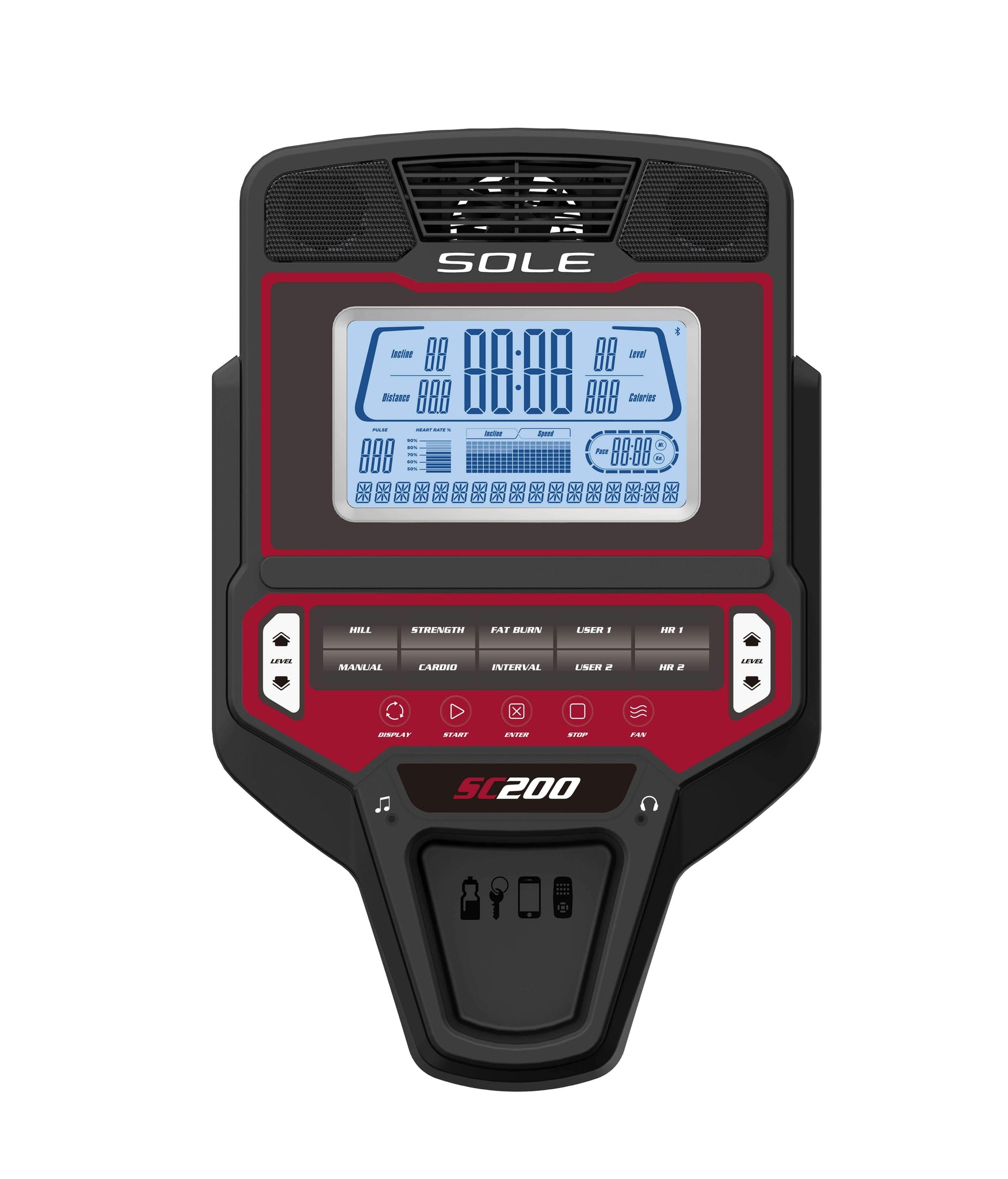 The Sole SC200 Stepper is equipped with a white backlit LCD display, it includes a built-in cooling fan and a water bottle holder. The console also has built-in speakers which allow you to hook up any MP3 player (iPod, etc.) for easy listening.
